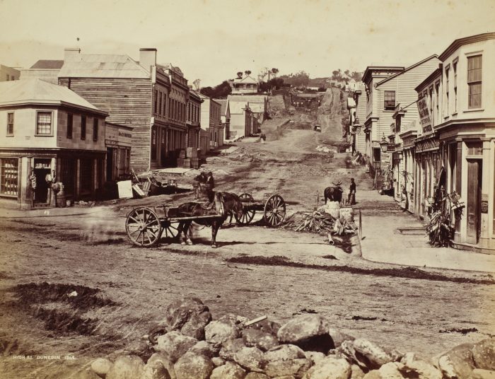 High Street, Dunedin, New Zealand, 1862. Showing the premises of HE Nathan & Co. Nathan was Sophia’s uncle, as well as an early Dunedin pioneer and successful businessman. Henry & Sophia married in Dunedin in 1864. Photographer: William Meluish. Museum of New Zealand Te Papa Tongarewa 0.001627