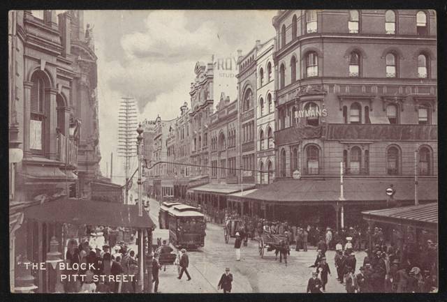 Intersection of Pitt & King Streets, c1914–1917, showing Mayman’s Liverpool Arms Hotel, owned by Henry & Sophia since 1896, on the right. National Museum of Australia, 1986.0117.0541