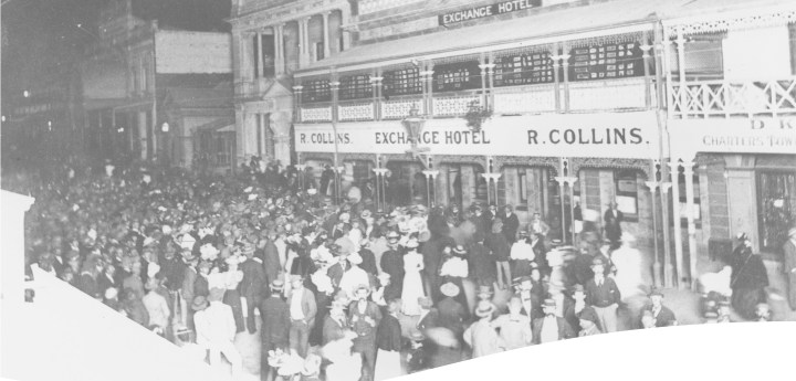 Feature image: Night of the referendum on Federation of Australia, Charters Towers, 1900, with Royal Arcade at far left. Marion Photos. State Library of Queensland, Negative number: 25141