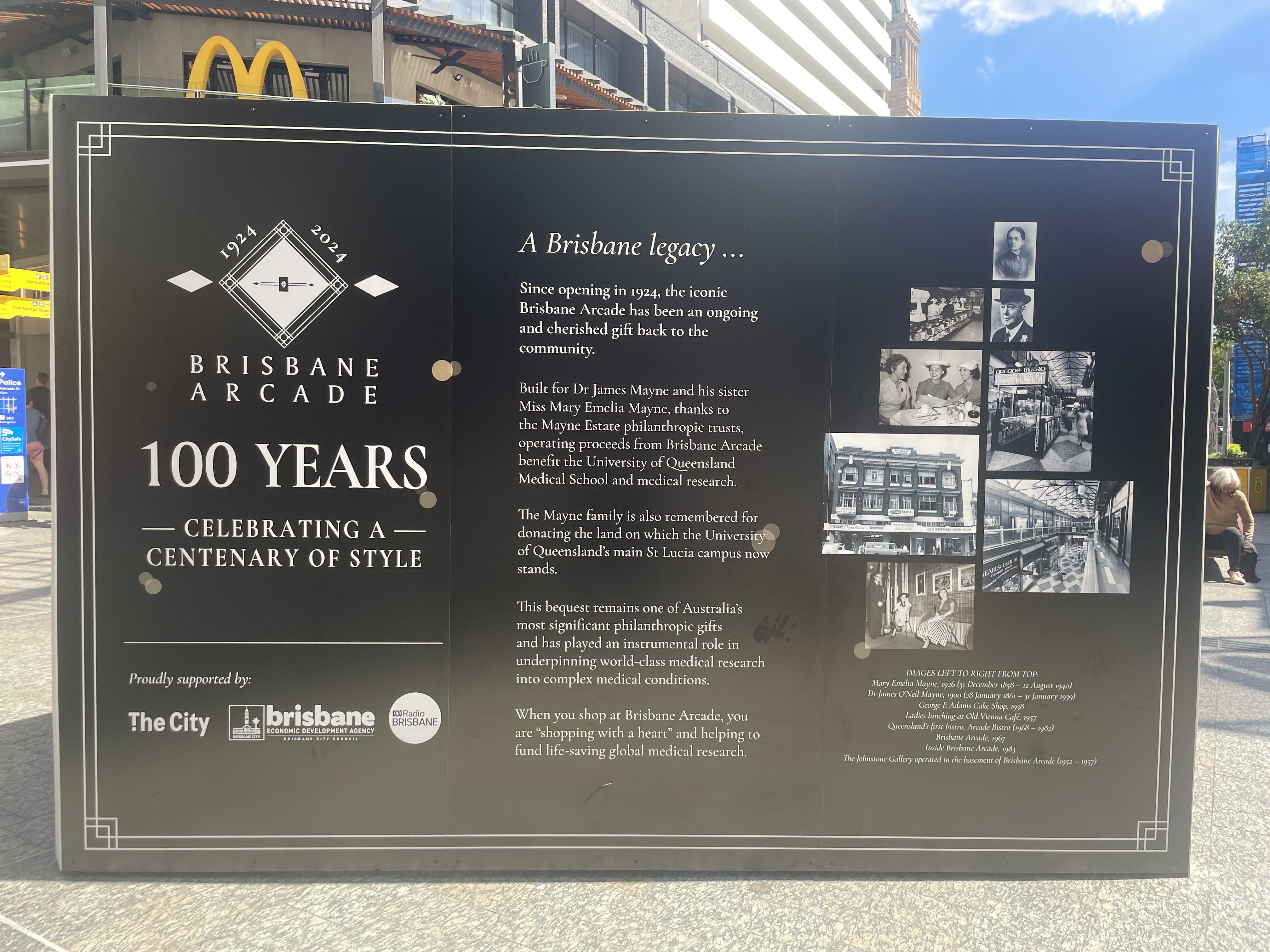 Like a number of earlier examples, the Brisbane Arcade had a woman owner: Mary Emilia Mayne and her brother, Dr James Mayne, commissioned architect Richard Gailey Jr to design the building, with construction beginning in 1923. The Maynes were significant benefactors in Brisbane, helping to establish the University of Queensland Medical School at Herston and, in 1926, the land at St Lucia, where the main university campus is still located today. On their deaths, in 1940 and 1939 respectively, they left the proceeds of their estates in trust for the medical school, including the income from the arcade.