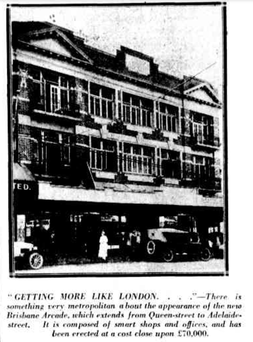 In Brisbane, this included the new Brisbane Arcade ‘of brick, with modern shops and plate-glass windows, this is considered equal to the best Sydney and Melbourne arcades, … [which] cost close upon £70,000’ (5 February 1924, 11).