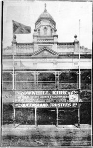 Immediately opposite, and running in a straight line, is the full acre allotment, the property of Mr. [O’]Sullivan, the timber merchant, and this gentleman has leased it to Mr. Black for eighteen years, at a rental of £3000 per annum. On this acre Mr. Black has bound himself down, in a heavy penalty, to erect an immense arcade, to consist of two-storied shops, forty feet high.